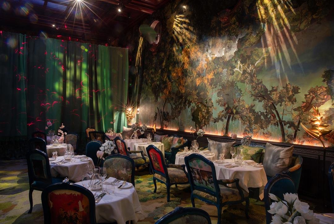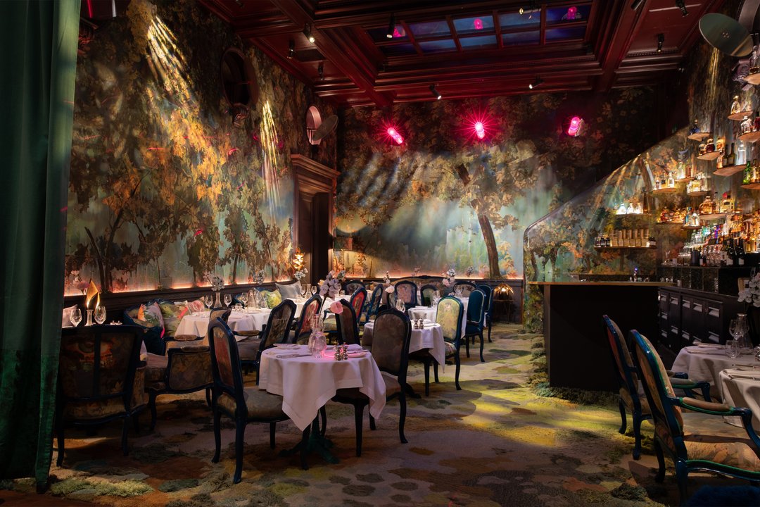The Glade offers breakfast, lunch and afternoon tea by day, before transforming into a refined cocktail bar in the evening. The Glade, designed by Mourad Mazouz in collaboration with artists Carolyn Quartermaine and Didier Mahieu, was elegantly decorated to enhance the room's forest-themed decor. Alexandra Kehayoglou created a hand-woven carpet in a natural color palette to mimic the forest floor's texture. Every piece of furniture is unique and hand-crafted by Quartermaine’s team of artisans.